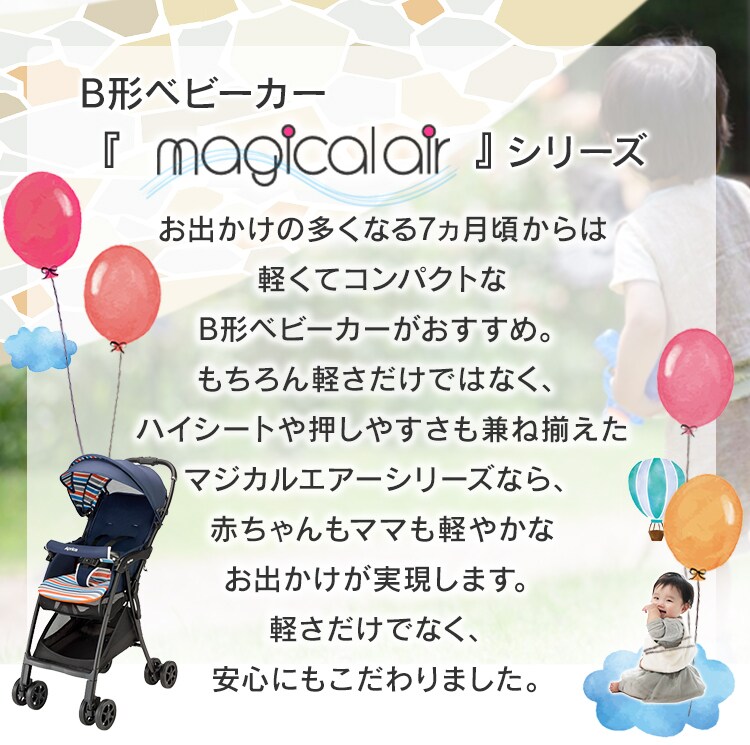 ひとり座りが出来るようになったら、赤ちゃんも一緒に楽しいお出かけ、軽さだけではなく安心にもこだわったベビーカーです。